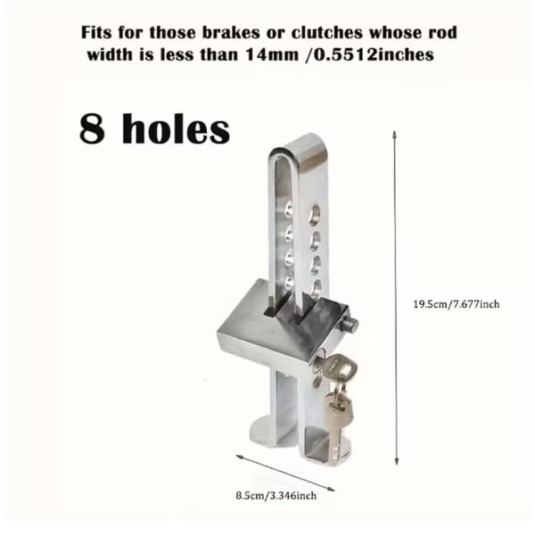 This universal auto pedal lock features an 8-hole adjustable design that fits most cars, SUVs, vans, and trucks. The adjustable height allows you to securely fasten it to the brake or clutch pedal, making it compatible with different pedal sizes and vehicle types. The lock includes two keys — one for everyday use and one as a spare for emergencies.